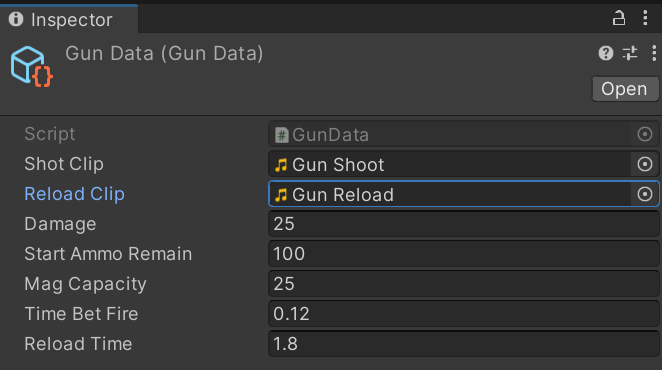 GunData를 선택후 인스펙터뷰에서 Shot Clip, Reload Clip필드의 소스를 선택해 오디오클립을 지정해줍니다.