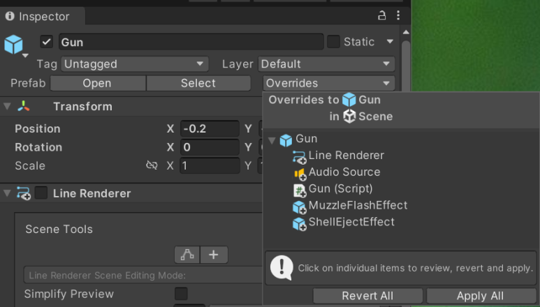 bulletLineRenderer.enabled = false; // 라인 렌더러를 비활성화, 스크립터에서 총을 쏠때만 나타나게 함