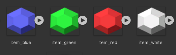 Ctrl-D로 3개 더 만든후 이름을 Item_blue, Item_green, Item_red, Item_white로 바꾸고