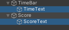 TimeBar, Score Image자식으로 UI>Legacy>Text를 추가한다. 이름은 TimeText, ScoreText로 바꿔준다. Text는 000 Font Size는 48~64로 설정한다.