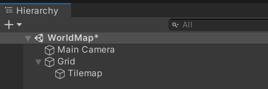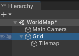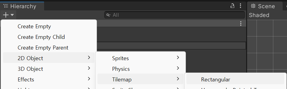 하이라키에서 + > 2DObjec t> Tilemap > Rectangular를 선택합니다. Grid와 자식으로 Tilemap게임 오브젝트가 추가됩니다.