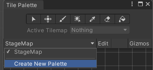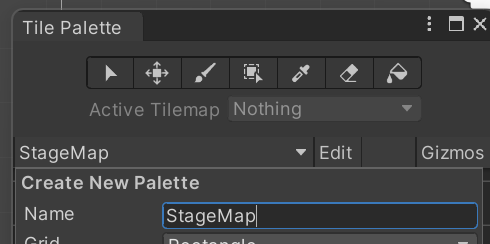 왼쪽위에 위치한 Create New Pallet를 클릭합니다. 이름을 StageMap으로 한후 Create버튼을 클릭하고 Map폴더에 저장합니다.