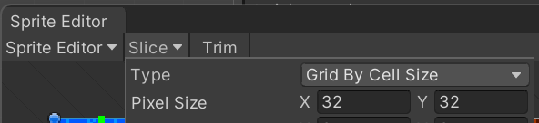 예제에 사용된 타일맵은 32x32로 제작되었으므로 Grid By Cell Size를 선택해 x:32 y:32로 설정해줍니다. 하단의 Slice를 클릭하면 이미지가 분할됩니다.