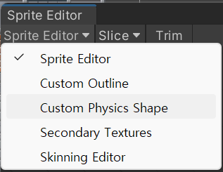 Sprite Editor창의 왼족 위에 풀다운 메뉴에서 Custom Physics Shape를 선택하면 충돌 판정을 패스로 설절할 수 있어 플레이어가 출입구로 진입하는 방향을 제한할 수 있습니다. 스프라이트를 선택하고 Generate를 선택하면 해당 스프라이트의 주변에 사각형 포인터가 배치되고 흰선으로 테두리가 만들어집니다. 하얀테두리 영역이 충돌판정 범위가 됩니다.