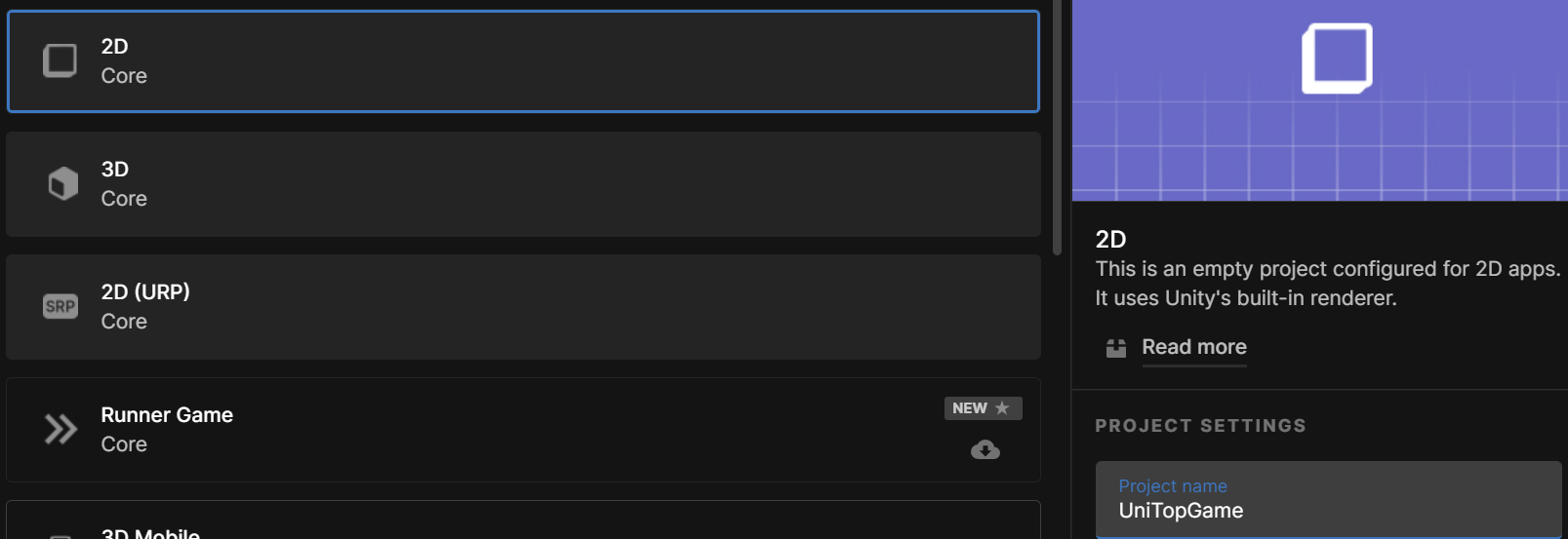 새로운 프로젝트를 만듭니다. 2D템플릿을 선택하고 프로젝트 이름은 UniTopGame 이라고 합니다.