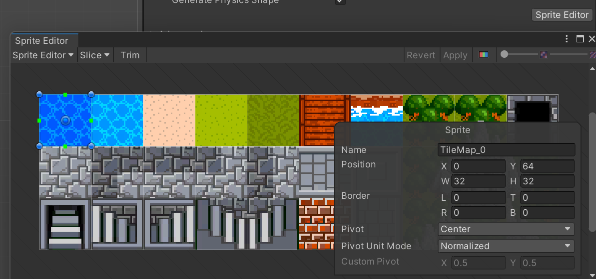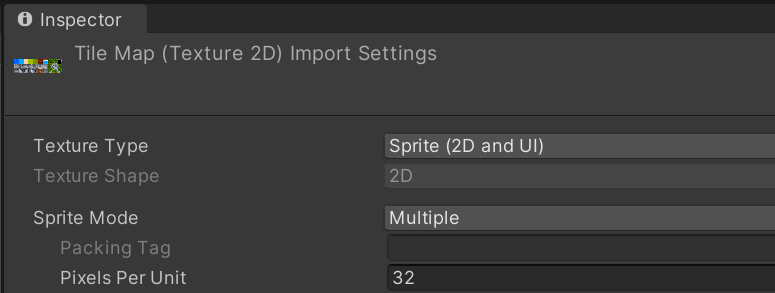 Pixel Per Unit는 기본값 100에서 타일맵사이즈인 32으로 변경합니다.