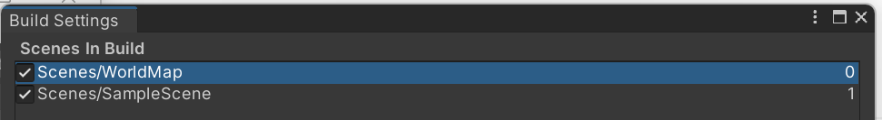 WorldMap이라는 이름으로 씬을 저장하고 빌드에 추가합니다.