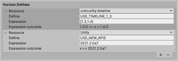 프로젝트가 특정한 Unity 버전이나 패키지 버전을 사용하는지에 따라 어셈블리에 다른 코드를 컴파일해야 하는 경우, Version Defines 리스트에 항목을 추가할 수 있습니다. 이 리스트는 기호가 정의되어야 하는 때에 대한 규칙을 지정합니다. 버전 번호에 대해 특정 버전이나 여러 버전으로 평가되는 논리적 표현식을 지정할 수 있습니다.