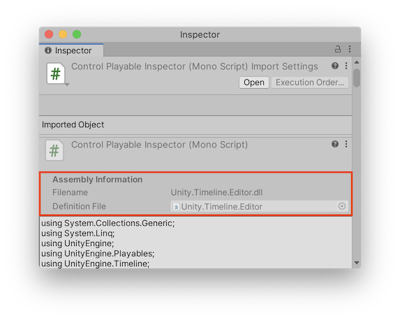이 예제에서 선택한 스크립트는 Unity.Timeline.Editor 어셈블리 정의 에셋에서 정의된 라이브러리 파일인 Unity.Timeline.Editor.dll로 컴파일됩니다.
