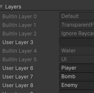 수류탄이 플레이어와 충돌하면 안되므로 Player, Bomb 레이어를 만들어 Project Settings Physics에서 Collision Matrix에서 Player-Bomb를 체크해제 합니다.