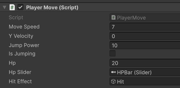 피격은 PlayerMove 스크립트에서 처리합니다 Hit을 연결해줍니다.