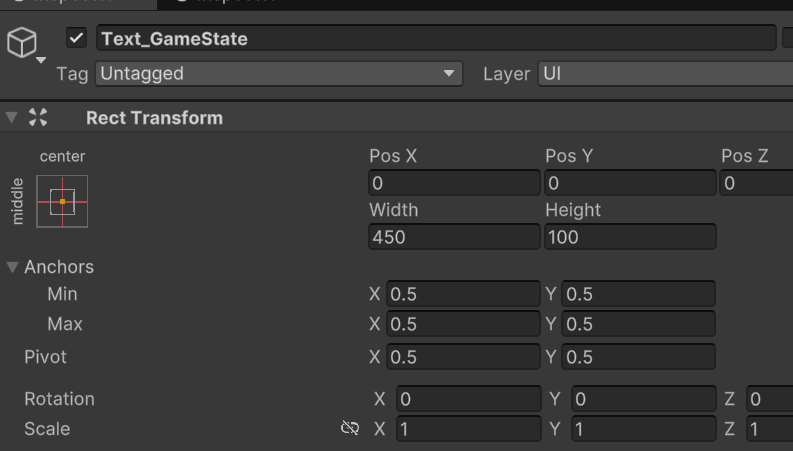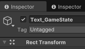 Text_GameState를 끌어다 놓고 Inspector의 체크를 Off로 시작하고 스크립트에서 처리합니다.
