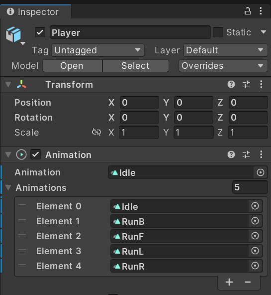 하이라키뷰에서 Player의 Inspector를 보면 Animation컴포넌트가 추가되어 있다 이는 레거시타입으로 설정된 모델을 의미한다. Animator가 추가되어 있다면 메카님 애니메이션이다.