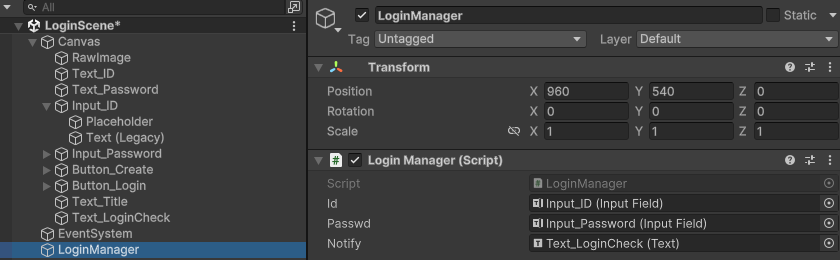 하이라키에 LoginManager 빈 오브젝트를 생성하고 LoginManager.cs를 끌어다 놓습니다. ID와 Passwd변수에 해당하는 UI>Input field를 연결하고 Notify에 알림 메시지 텍스트 오브젝트를 추가합니다.