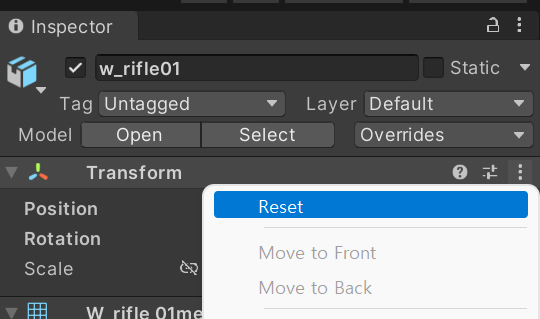 하이라키의 라이플을 선택하고 transform을 리셋한다.