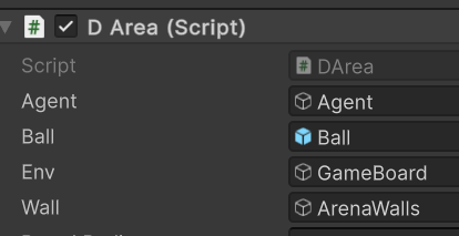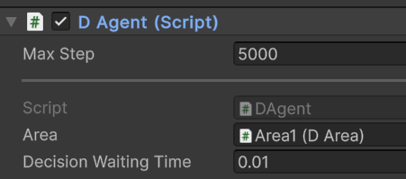 Area Prefab의자식 Agent를 선택하고 DAgent의 변수 MaxStep을 5000으로 설정합니다. 에피소드 종료조건이 만족하지 않아도 5000스템 이상일 경우 강제 종료됩니다 Area에는 Area프리팹의 부모 또는 스크립트를 끌어다 놓으면되고 DecisionWaitingTime은 0.01로 설정합니다.