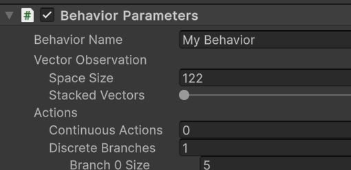 Agent 인스펙터안에서 Space Size를 40(광선수)x3(각 레이에 포함된 정보의수) + 2 (에이전트의 x ,z 속도) = 122를 설정합니다.