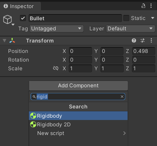 하이라키의 Bullet오브젝트를 선택한후 인스펙터뷰에서 Ridigbody컴포넌트를 추가한다.