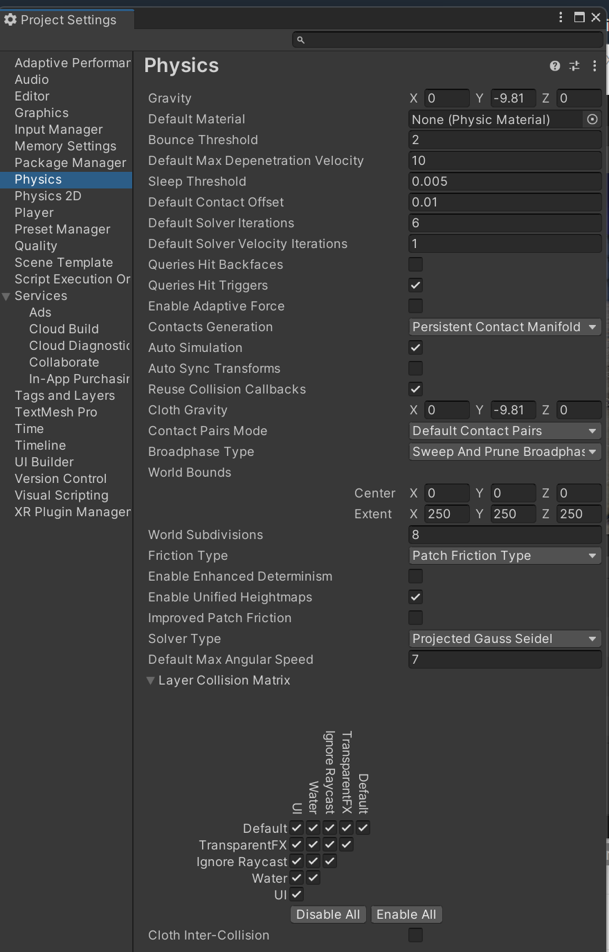 | 기본 접촉 오프셋 | Default Contact Offset : 충돌 감지 시스템이 충돌 접촉을 생성하는 데 사용하는 거리를 설정합니다 . 값은 양수여야 하며 0에 너무 가깝게 설정하면 지터가 발생할 수 있습니다. 기본적으로 0.01로 설정됩니다. Collider는 거리가 접촉 오프셋 값의 합보다 작은 경우에만 충돌 접촉을 생성합니다. |