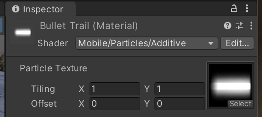 완성된 Material을 Bullet에 추가된 Trail Rendere컴포넌트의 Material속성중 Element0에 끌어다 놓는다. 이러면 분홍색에 텍스처가 입려진다.