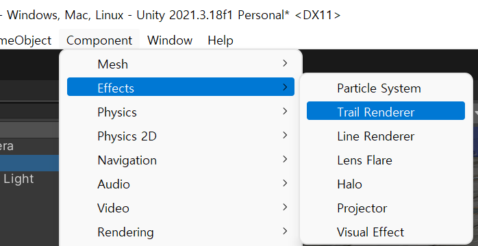 하이러키 뷰에서 Bullet을 선택하고 메뉴에서 Component>Effects>Trail Renderer를 선택해 Trail Renderer를 추가한다. Bullet의 Z축을 잡고 앞으로 드래그하면 동적으로 생성된 메시를 볼수 있다. 이때 씬뷰의 렌더링모드를 Wireframe으로 변경하면 동적으로 만들어진 메시의 형태를 볼 수 있다.