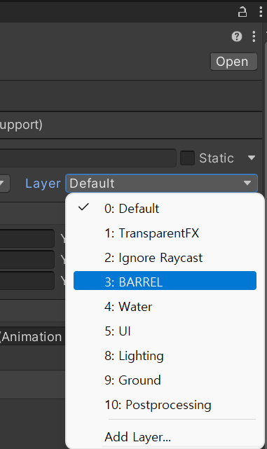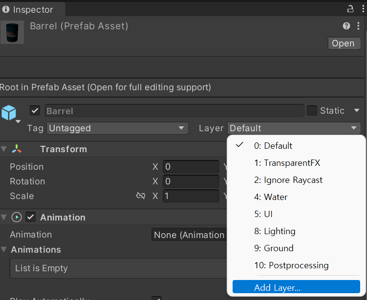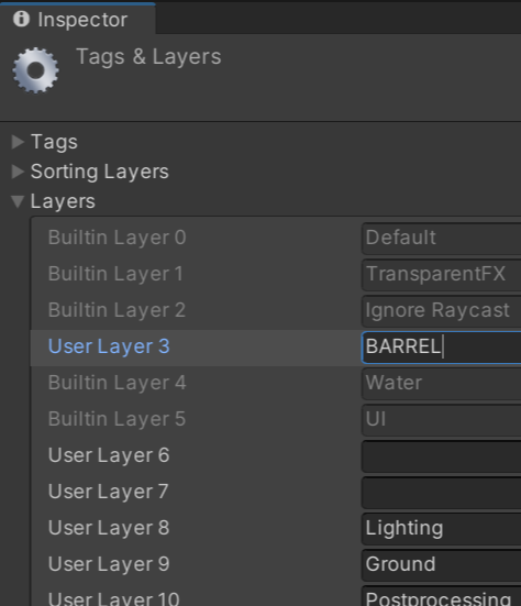 스크립트를 변경하기전 Layer를 추가한다. 유니티는 게임객체를 각각의 레이어에 배치해 로직을 필요한 레어어에만 적용할 수 있다.