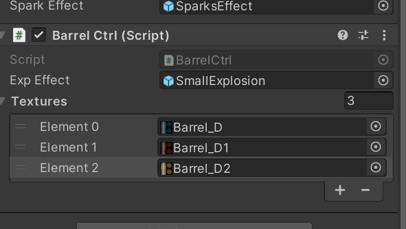 Barrel Prefab 원본에 Models/Barrel폴도안의 Barrel_D, Barrel_D1, Barrel_D2를 끌어다 Barrel Ctrl Script의 Textures에 끌어다 놓는다.