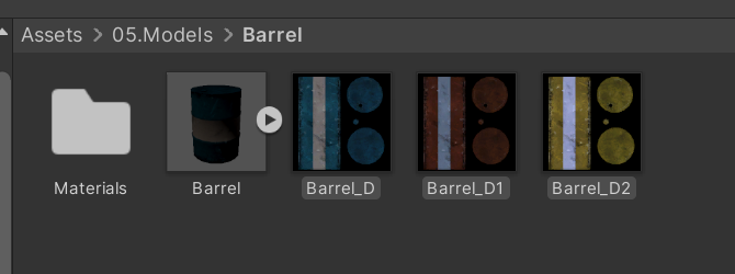 여러개의 드럼통의 같은 텍스처로 적용되여 있다. 시작과 동시에 다양하게 바꿔보자. 텍스처의 적용은 Mesh Rendere 컴포넌트에 연결된 Material에서 지정한다. 여기에 사용한 Barrel모델의 Mesh Renderer컴포넌트는 Barrel 하위에 있는 Barrel에 적용되어 있다. 부모 오브젝트는 빈 오브젝트이다.
