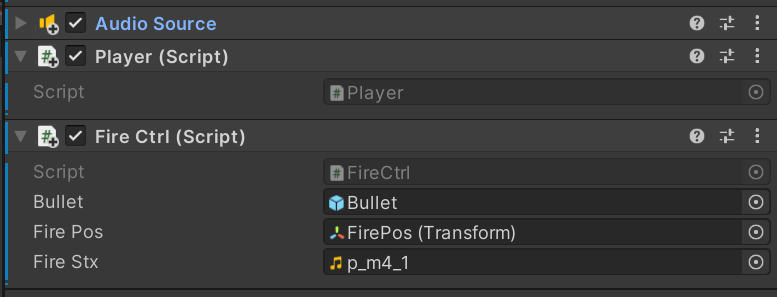 Bullet프리팹을 선택해 AudioSoruce컴포넌트를 추가한다. 속성은