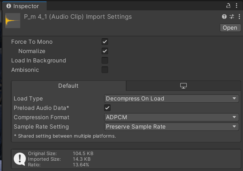 Decompress On Load : 로드시 압축을 해제하므로 사이즈가 큰 파일은 오버헤드를 발생시킨다. 작은 사이즈의 오디오에 적합하고 압축후에는 CPU자원을 덜 소비한다.