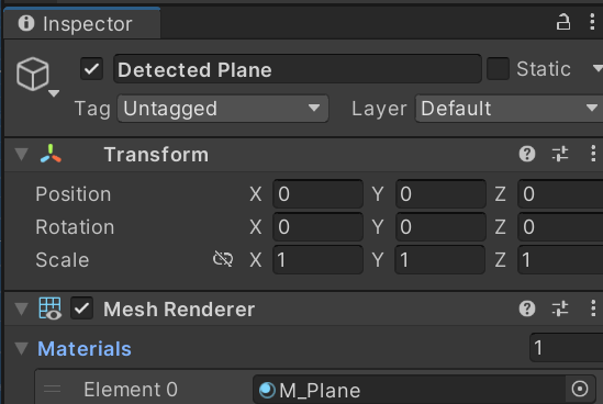 이제 프리팹 폴더의 DetectedPlain을 선택하고 Inspector에서 Materials Element0에 아가 만든 머터리얼을 끌어다 놔준다.