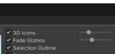 씬뷰의 기즈모를 줄이기 위해 뷰포트 우상 기즈모 위 지구본 옆 아래 화살표를 누르면 3D Icons를 줄일수 있다.