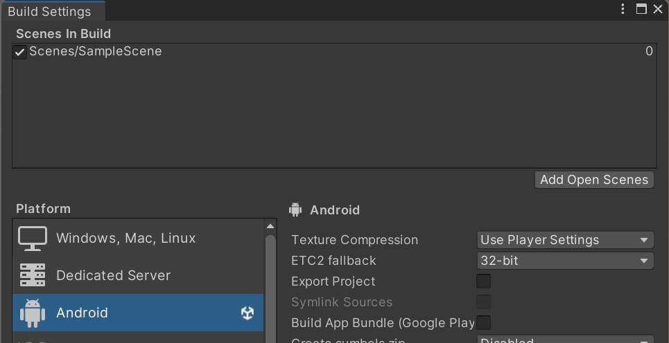 File>Build Setting에 가서 Add Open Scenes를 클릭해서 현재 씬을 넣어준다 물론 Andrid 가 선택되어져있어야한다.