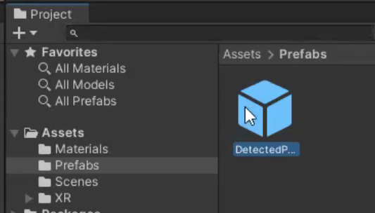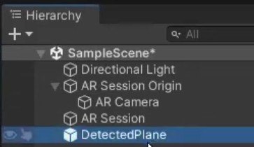 Assets폴더에 Prefabs폴더를 만들고 들어가서 하이어라키의 DetectedPlane을 끌어다 폴더에 놓는다. 이후 하이라키의 DetectedPlane은 지운다.